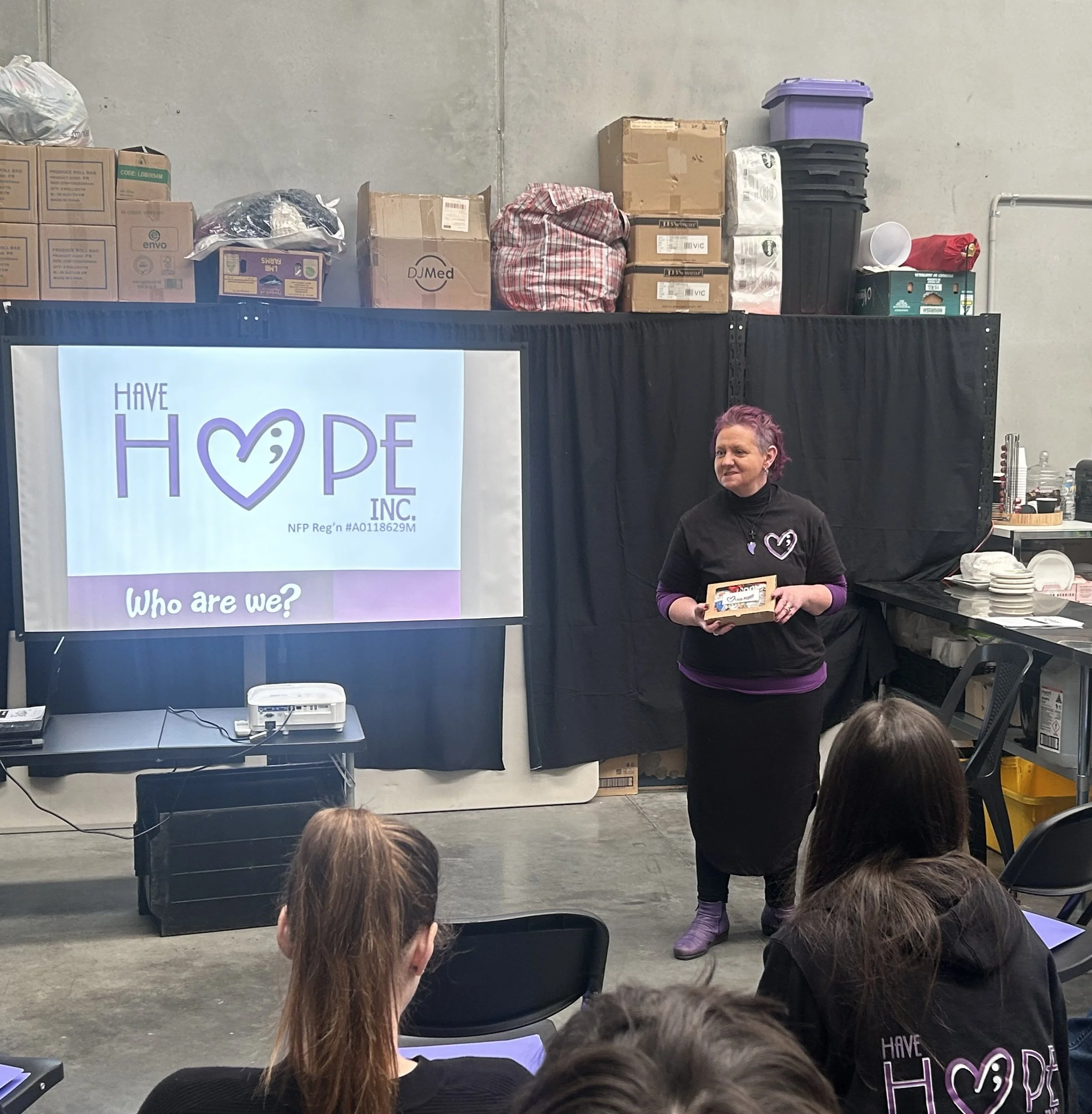Have Hope; members are safeTALK (Suicide Alertness for Everyone) trained and we also have ASIST (Applied Suicide Skills Trained) personnel at our site.